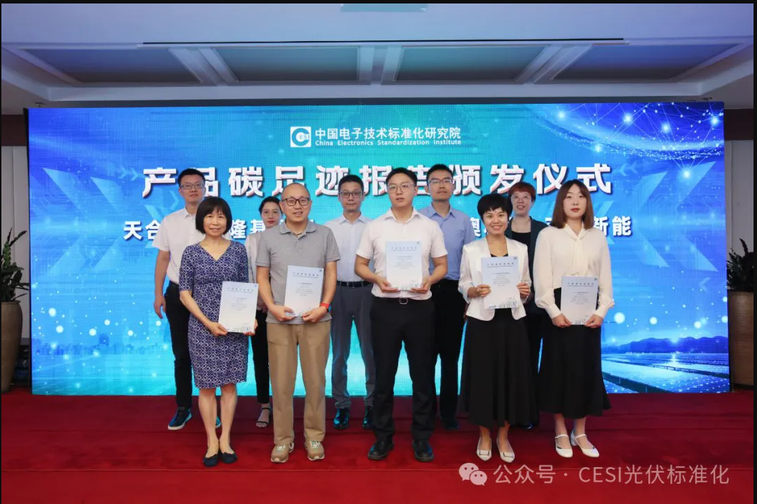 杨旭东院长、王莉莉四级调研员、宋柏函主任、柴麒敏主任、张军华主任为电子标准院牵头建立的“光伏行业产品碳足迹基础数据库及核算平台”启动发布仪式,并为天合光能股份有限公司、隆基绿能科技股份有限公司、通威股份有限公司、晶澳太阳能科技股份有限公司、正泰新能科技股份有限公司5家行业骨干龙头企业颁发首批应用核算平台出具的产品碳足迹核算报告。