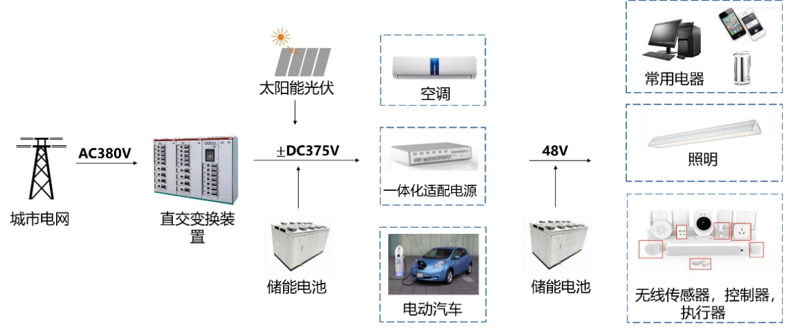 本示范项目基于低压直流配电技术构建了集成屋顶光伏、多种建筑分布式储能和直流用电电器在内的“光储直柔”系统,采用了基于直流母线电压的自适应控制技术,解决了传统交流并网光伏系统出力随机,储能和光伏耦合控制稳定性差的问题, 特别适合负荷需求多样化、分布式新能源接入规模化的发展要求。低压直流配电与传统的交流供电架构相比,具有转换效率高、电能损耗小、可控性强等优势,特别适合负荷需求多样化、分布式新能源接入规模化的发展要求。本示范项目构建了包括直流配电设备、分布式电源、直流用电电器、直流用电保护以及智能微网控制在内的低压直流配电工程。系统整体架构设计遵循简单、灵活的原则,力求通过最简洁的架构达到分布式能源灵活接入、灵活调度和安全供电的目的。